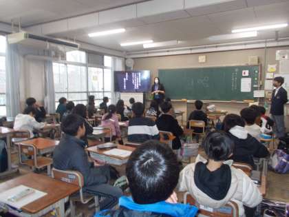 オープンスクール 公開日 2023/12/05 更新日 2023/12/05 学校の様子 本日、午後から藤森中ブロック4小学校の6年生をお招きし、オープンスクールを行いました。 来年度4月から過ごす藤森中学校の雰囲気を感じてもらうため、はじめに生徒会から藤中の紹介を行い、その後、実際に授業を体験してもらいました!