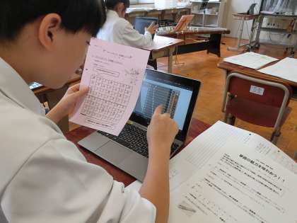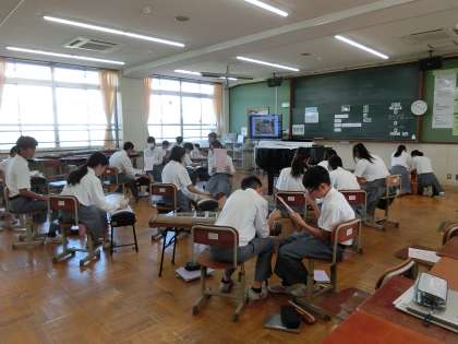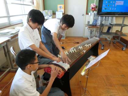 合唱コンクールで元気いっぱいの素敵なハーモニーを響かせてくれた1年生は、今週から筝曲「六段の調」の学習に入っています。箏の演奏と筝曲の鑑賞を組み合わせた学習です。本日は、「演奏を通して箏の音色の美しさや余韻の響きを感じ取ろう」という目標で「さくらさくら」を演奏しました。タブレット端末を活用して演奏の練習を行った後、実際に箏爪をつけて本物の箏の演奏を行いました。華やかで繊細で、時に凛として力強い箏の音色は、とても魅力的でした。ペアで協力して、「七七八〜♪」と歌ったり、教え合ったり聴き合ったり、本当に楽しそうに学んでいる姿が微笑ましかったです。「もっとやってみたい!」「自分にも簡単にできた!」「楽しかった!」という声がたくさん聞けました。