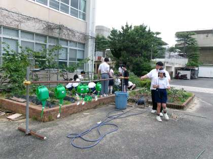 学校の中庭にある畑で、なすやミニトマト、ピーマンなどを育てています。