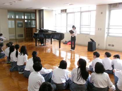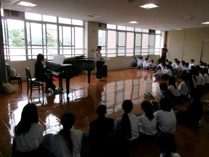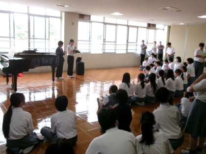 実習生ミニコンサート 公開日 2025/06/06 更新日 2025/06/06 学校の様子 本日お昼休み、1・2年生向けに音楽科の教育実習生によるミニコンサートが行われました。3週間、教育実習に取り組んだ実習生よりお礼を伝える代わりに歌を生徒に届けました。ささやかでしたがとても心温まるミニコンサートになりました。実習生のみなさん、本校での実習で取り組まれたことを大学を卒業されてからも実践してください。みなさんの今後のご活躍をご祈念しております。