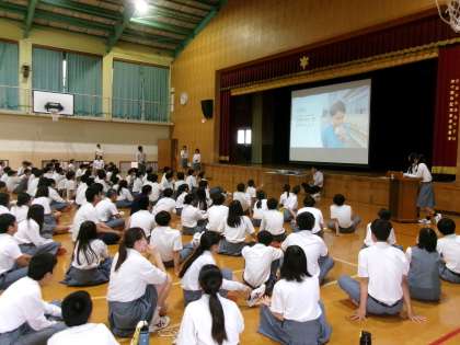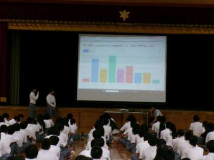 本日3時間目、2年生の夏休み前学年集会を行いました。各クラスの評議員より4月から7月のクラスの様子や様々なアンケート調査の結果の紹介がありました。多くのクラスで「仲が深まった」という共通の意見が見られました。しかし、「授業や休みの切り替えが悪くなった」という意見も見られ、夏休み明け以降、さらに改善しようという意識を持つ機会になりました。その後、評議員の夏休みの過ごし方に関する寸劇を通して、より良い夏休みの過ごし方について2年生全員で考えました。次に、学年の先生に関するクイズでレクリエーションを行い、先生方の意外な一面を知り、先生方やクラスの仲間と親睦を深めることができました。