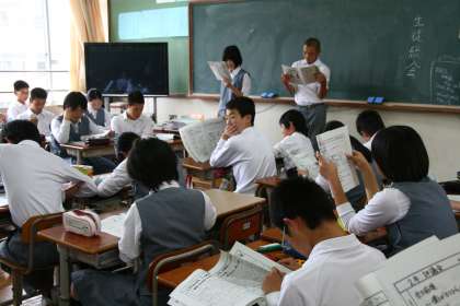 2枚の写真は読み合わせのようす。どのクラスにも、「名人」というか、味のある読み方をする生徒はいるようで...