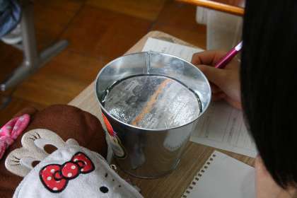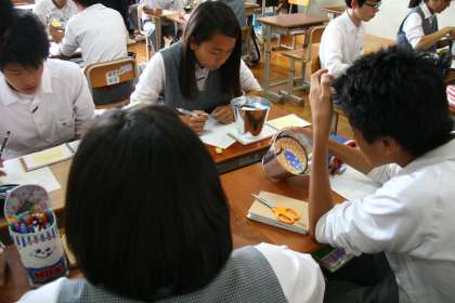 3年生美術の授業。「水」。言葉としては同じ「ミズ」だが、一人ひとりの「水」はまったく違う。それをそれぞれが作品に仕上げ、そこに「詩(ポエム)」を付け加えたおしゃれな代物です。その丸い作品を「バケツ」という額に入れ、お互いの作品を鑑賞するという授業。