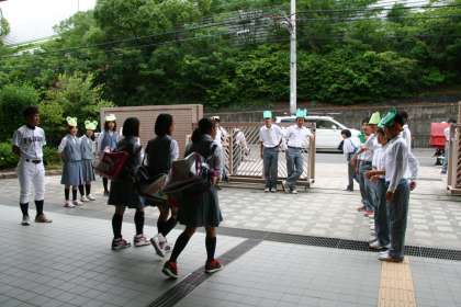 完全下校を呼びかける「カエル」たち。