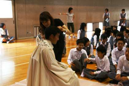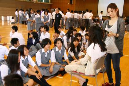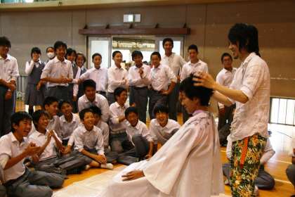 プロの技に学ぶ (2年生) 公開日 2014/06/23 更新日 2014/06/23 2年生 2年生は「生き方探究・チャレンジ体験」に向けての事前学習として、プロの美容師の方4人に来校いただき、実際の技を目の当たりにした。 男性の先生2人はカットしてもらう。生徒たちは大きな変化を望み、「目をつぶってカットするプロの技を見せて!」などという発言も聞かれましたが、結果は無難な完成となりました。女性の2人の先生はスタイリングをしてもらい、美しく変身です!