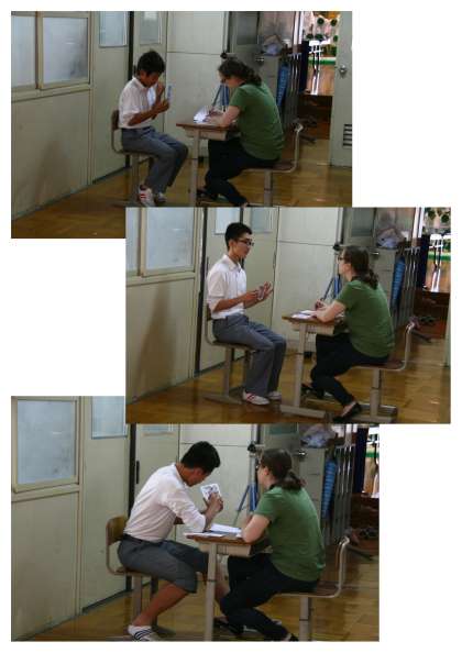 3年生の英語。教室で課題をやっていながら、一人ずつ順番に廊下へ。