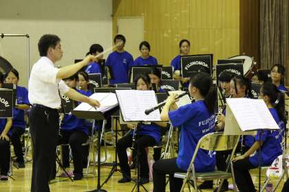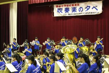 吹奏楽の夕べ 公開日 2014/07/28 更新日 2014/07/28 学校の様子 7月25日(金)、竹田小学校から始まった「第36回 吹奏楽の夕べ」。 最高気温が体温を超える非常に暑い日。開演の夕方6時になっても、まだまだ気温は高い状態でしたが、吹奏楽部員は元気いっぱいに演奏を行いました。 第1部はみんなの歌コーナーを含め、今年の吹奏楽コンクールでの演奏曲を披露しました。