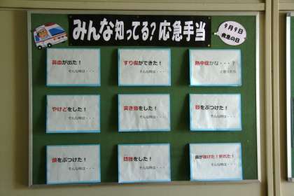 保健室前には、下の写真の掲示物「みんな知ってる?応急手当」が貼ってあります。