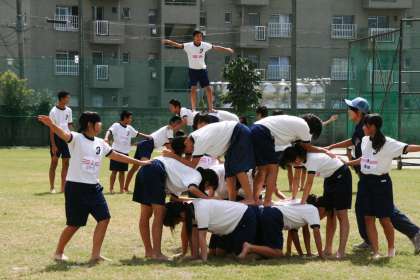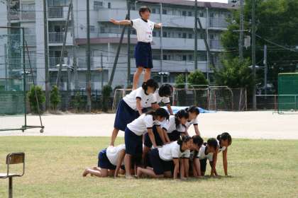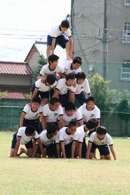 組み立て体操 公開日 2014/09/12 更新日 2014/09/12 3年生 3年生の組み立て体操の練習風景。屋内で何度も練習を重ね、今日は芝生の上での練習。 安全を第一に考え、補助する生徒の役割も重要です。 男子の方は、気合いを入れて気持ちを一つにするためにも、かけ声を出したりもしていました。 本番での勇姿をお楽しみに!