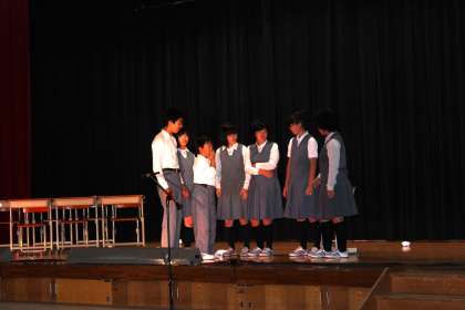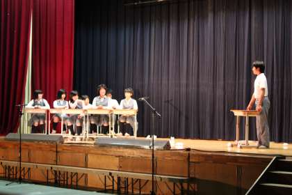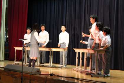 11組 公開日 2014/09/25 更新日 2014/09/25 学校の様子 文化祭前の学級のようすから始まる生活劇を演じた11組のみなさん。 ハンドベルの演奏も含めて、毎日まいにち、練習を重ねてきました。 最初の頃のようすを知っているだけに、あぁ、ほんとうに上達したなぁ、と感じ入りました。ハンドベルでの「校歌」と「大きな古時計」。会場全体が「しん」となって聴き入りました。