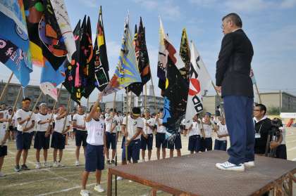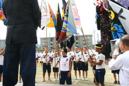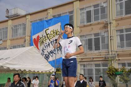 みんなへの言葉、そして……宣誓! 公開日 2014/10/02 更新日 2014/10/02 学校の様子 生徒会副会長の挨拶のあとは、体育委員長の「選手宣誓!」四字熟語を多く使った、独特の力強い宣誓でした!