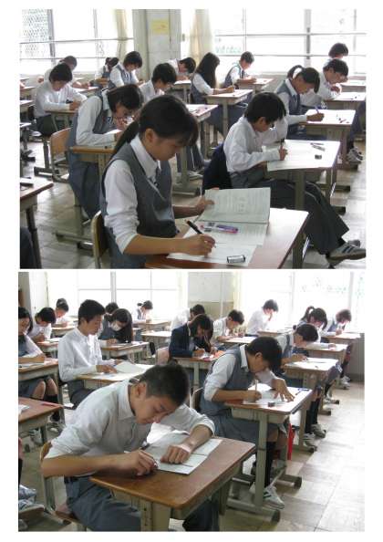1年生は理科。2年生は社会。3年生は国語。11組は社会のテストに、それぞれ取り組んでいます。