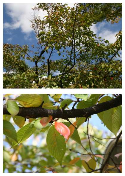 学校の木々も、少し色に変化が見られます。全体を見ると気づかないんですが、一部分を切り取ると... ほら、「秋」が浮かび上がります。