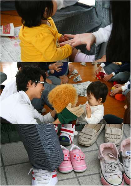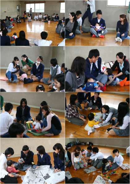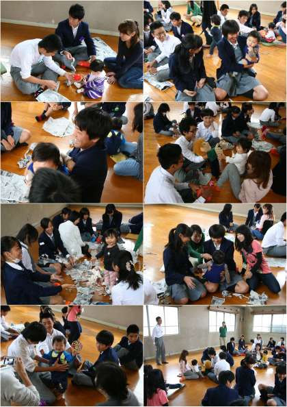 いつも児童館でやっているように、歌をうたって始まりました。中学生はまだまだ照れがあるのかニコニコしているだけ。でも、新聞紙を使って遊ぶころには、生徒からの関わりが出てきます。見ているだけでもニコニコなのに、触れたり抱っこしたりすると、もう・・・。靴の小ささにもびっくりしていました。