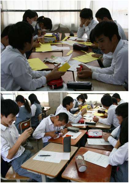 妖怪ウォッチならぬ「ネーム ウォッチ」 公開日 2014/10/27 更新日 2014/10/27 1年生 1年生は6限、小学校訪問で伺う1,2年生に渡す「名札」を作りました。 名札といっても、一般的な名札を思い浮かべてもらってはいけません。 ある生徒の発想で、妖怪ウォッチならぬ「ネーム ウォッチ」。この時計の文字盤の部分に名前を書くそうです。(一番下の写真) 生徒のアイデアはほんと、面白いですね。