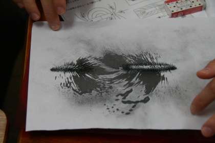 ※写真は鉄粉を振った紙を指で軽くはじきながら、上手に磁力線を浮かび上がらせているようす。