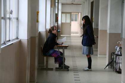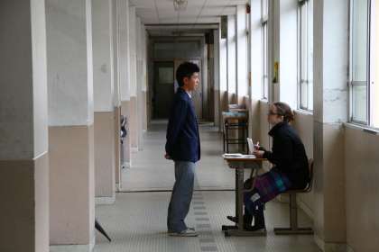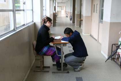 英会話テスト 公開日 2014/11/18 更新日 2014/11/18 2年生 これも2年生、英語の授業。ALTのサラ先生による英会話テスト。 前もって提示された5つの質問のうち3つ質問されるという形式のテストだそうですが、廊下で1対1になることもあり、教室内で順番を待つ生徒も緊張していました。