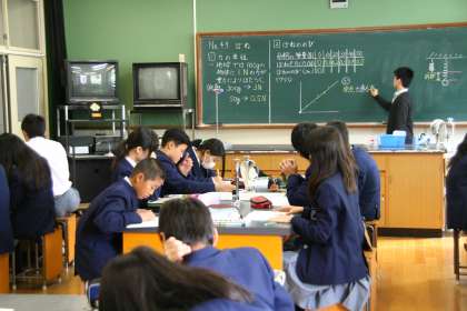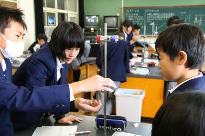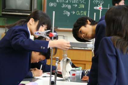 未来の科学者!? 公開日 2014/11/19 更新日 2014/11/19 1年生 1年生の理科の授業。 バネにかかる力と伸びの関係を調べる。先生の指示をよく聞いてスムーズに実験・観察が進んでいました。「ニュートン(N)」という単位や「フックの法則」など、新たな用語についてもインプットしていきます。