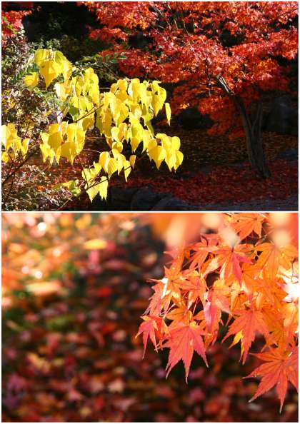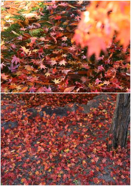 日本庭園のもみじ。 地面に、池の水面に 散り敷いた落ち葉...。 見ごろの終わりを迎えています。