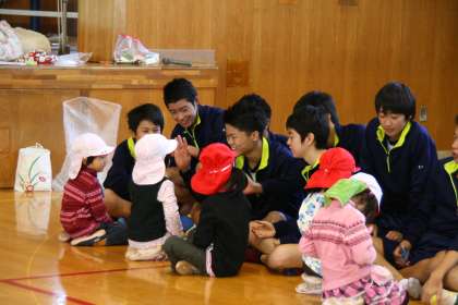 初めての出会いに、少し恥ずかしげにしていた幼児もいましたが、ハイタッチをしたり抱き上げたりで、すぐに打ち解けました。