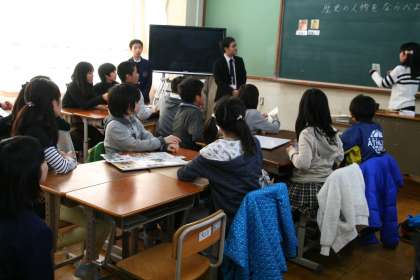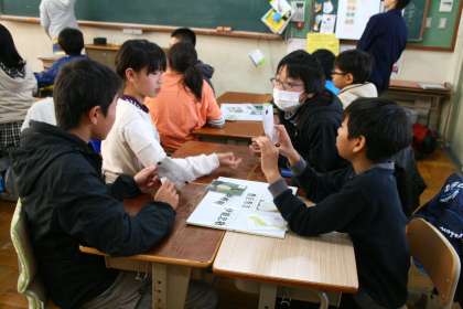 社会科、歴史の勉強。歴史上の人物について、生まれた順に並べています。なかなか詳しく知っている児童がいました。