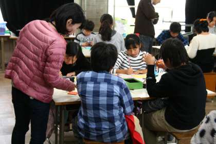 美術の授業。「自分を表現しよう!」と、色や形での自己表現に取り組んでいます。最後にはどんな作品に仕上がったかな?