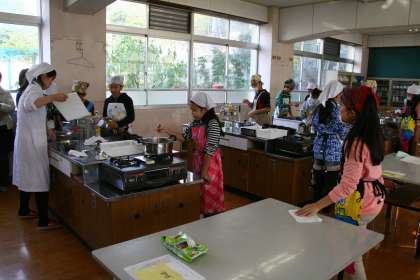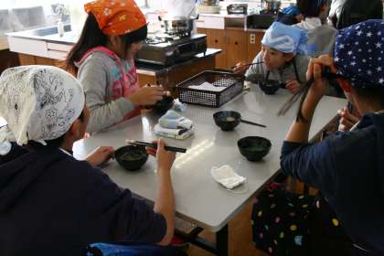 体験授業のようす 11 公開日 2014/12/03 更新日 2014/12/03 学校の様子 最後の11講座目は「技術家庭科」です。とっても寒かった今日。そんな寒さの中、見るからに温かな、湯気まで立っている授業。そう、調理実習です。 技術の時間に水耕栽培した水菜のお吸い物を作るという授業内容。昆布とかつお節を使ってだしを取るという本格的な実習でした。 児童たちはフーフーしながら、「美味しい!」と味わっていました。