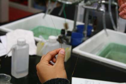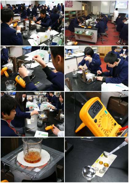 科学センター学習 「砂糖大発見!」 公開日 2014/12/09 更新日 2014/12/09 学校の様子 砂糖水が温度によって変化するようすを実験で確かめる。 スイッチを入れて砂糖水の入ったビーカーを熱します。 ・・・・120度、・・・180度、・・・そして200度...。 透明だった砂糖水は、茶色くねっとりした状態に。 中には、おはしをじょうずに使って、糸のように、針のように細く長〜く伸ばしている生徒もいました。