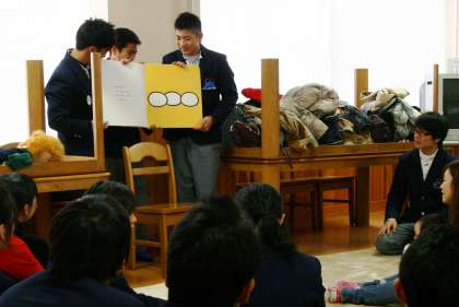ふれあい体験 「絵本を読む」 公開日 2014/12/10 更新日 2014/12/10 3年生 大型絵本を3名の男子生徒が読んでます。 あっ! 聞いてる、聞いてる! 幼児のみなさんも、絵本に目と心が...。