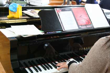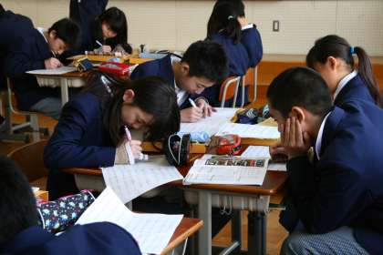 歌っている曲は「赤とんぼ」。みんな知っている ♪「夕焼け小焼けの赤とんぼ 負われて見たのはいつの日か」と一人ずつ歌っています。みんなの前で歌うのは、とっても緊張しますよね。(歌っている人以外は、プリントの課題に取り組んでいます)