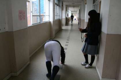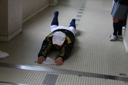 「ヨーイ、スタート!」の合図で、廊下の雑巾がけを行う2年生の生徒。