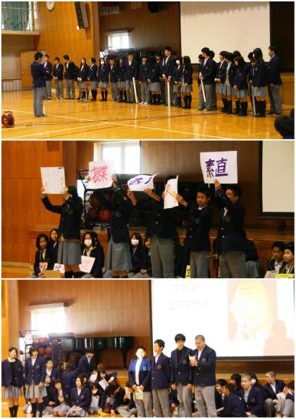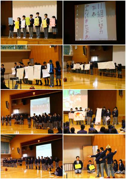 「いじめをなくす。言葉だけでなく...」といった発表や、少年兵の問題を掘り下げ、「自分の意志を持ち、相手に伝えていこう」といったもの。また、「あいさつの大切さ」を劇で演じたクラス、マララさんの演説やガンジーやマザーテレサについて発表するクラスなど、まことに多岐にわたる発表内容でした。