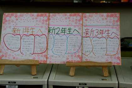 後ろには、卒業生からのメッセージ。それぞれ色紙には、「新3年生へ」「新2年生へ」そして、まだ顔も知らぬ「新1年生へ」のタイトルが...