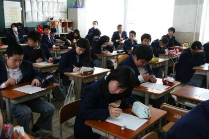 2年生の国語の時間、生徒たちは3月6日に行われた「公立高校中期選抜検査」の問題に挑戦。