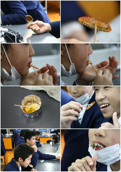 自分で作ったべっこう飴ですので、それは大事そうに口に入れてます、