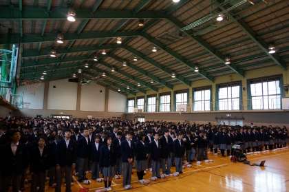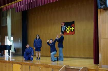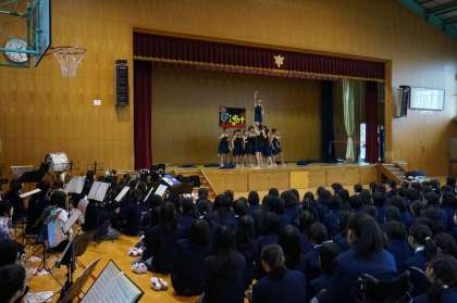”応援団Fソウル”によるオープニングに続き、校歌斉唱、藤中での1日や藤中生徒会の紹介、そして本校で活動しているすべての部活動紹介が行われました。
