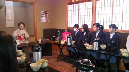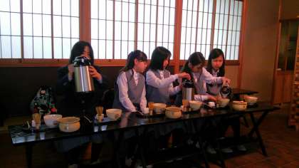 文化部もがんばっています! 公開日 2015/04/30 更新日 2015/04/30 学校の様子 茶道部は、4月29日に平等院対鳳庵という宇治市営茶室にお点前体験をしてきました。 茶道の先生のお点前を見学してから、自分でお茶を点ててみる…といった内容でした。 いつもよりも濃いお茶の苦さを感じながら、おいしい和菓子を頂き、 生徒たちも満足してました♪