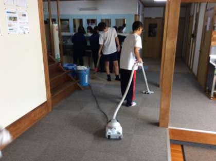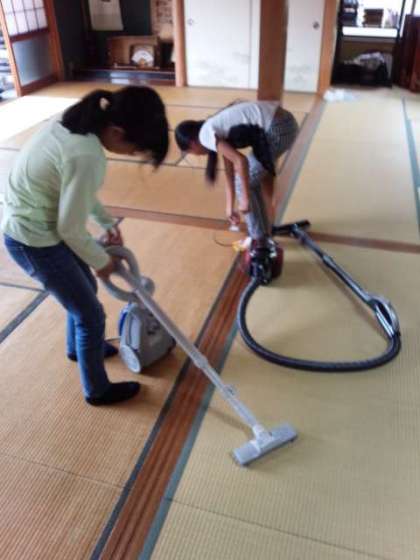 お世話になった宿のお掃除もみんなで協力してやってます。