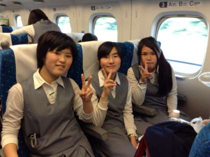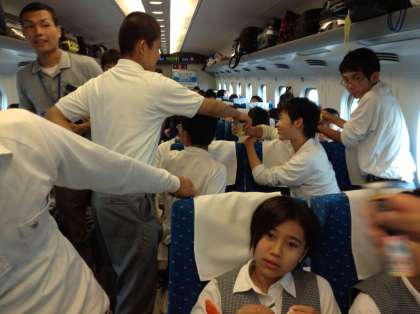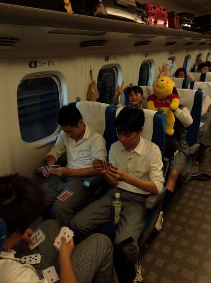 新幹線車内の様子です。 子供たちは、とにかく元気。よく食べ、よく遊びます。