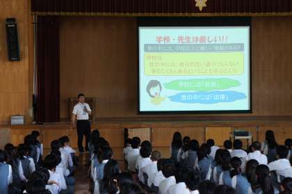 本日、1年生は、京都市教育委員会生徒指導課の石塚担当課長を講師として招き、非行防止教室を実施しました。