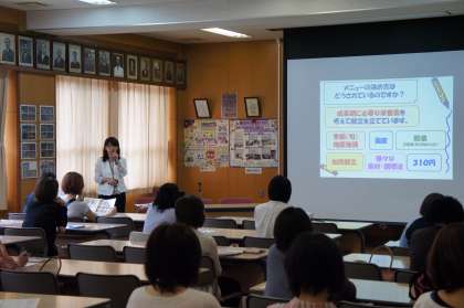 参加していただいた保護者のみなさんには、京都市教育委員会体育健康教育室 増田真弓指導主事から講演をしていただいた後、実際の中学校給食を試食していただきました。