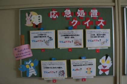 今回の掲示物は、手作り感満載の「応急処置クイズ」