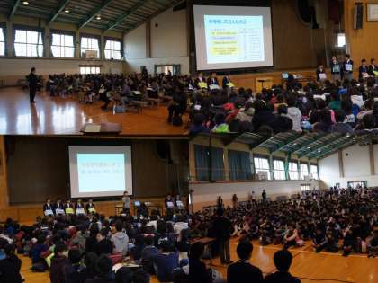 まず、新入生保護者向けの入学説明会が実施され、その後、来年度入学予定の校下4小学校の6年生が加わり、生徒会中心に学校生活の様子や質問コーナー、ゲームなどを行いました。