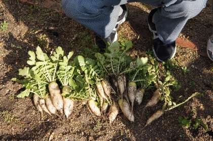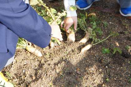 大根収穫 公開日 2015/12/24 更新日 2015/12/24 学校の様子 本日の放課後、緑化委員会が育ててきた大根が収穫されました。 一生懸命に手を入れたのですが、少々小ぶり(かなり小さな)大根でした。 大きさは、ちょっと期待外れでしたが、味で勝負とお世話をしていた緑化委員の生徒は、自信満々。 結果はどうだったのでしょうか?