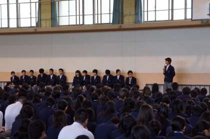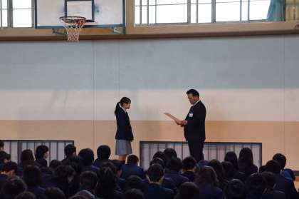1限目の全校集会では、生徒会から、今年の藤中生としての心構えと目標を確認した後、吹奏楽部の伝達表彰が行われました。吹奏楽部は、平成27年度こども音楽コンクール西日本優秀校発表音楽会にて中学校管楽合奏部門で優秀賞を受賞しました。