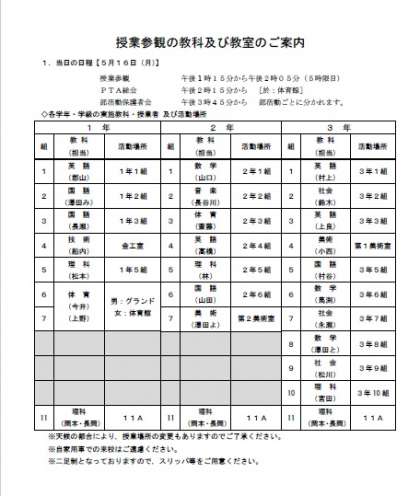 お知らせ 公開日 2016/05/12 更新日 2016/05/12 お知らせ 5月16日(月) 5限授業参観 6限第2回PTA総会 放課後 部活動保護者会 が開催されます。 授業参観の時間割及び部活保護者会の会場を掲示しておきます。 ご確認ください。