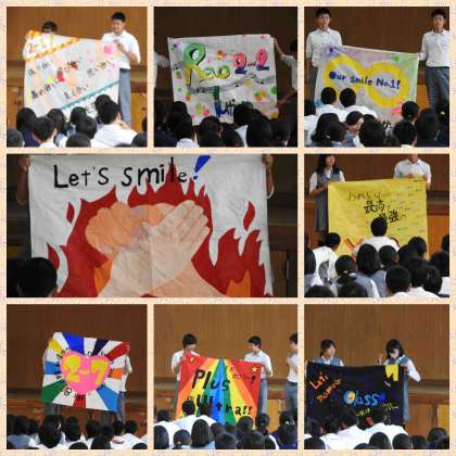 各学級で作成した、旗の発表会を行いました。 中央にあるのは学年旗です!