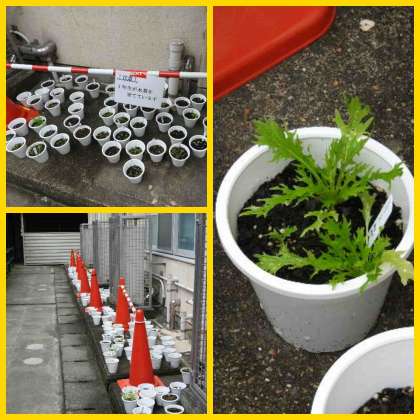 2号館南側では1年生技術家庭での教材、水菜が鉢植えされています。これからの成長が楽しみですね。