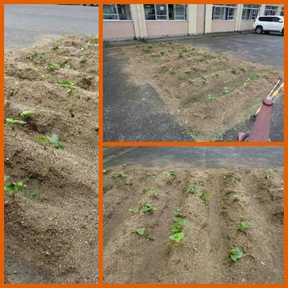 中庭には緑化委員会がジャガイモを収穫した後にサツマイモを植え付けました。