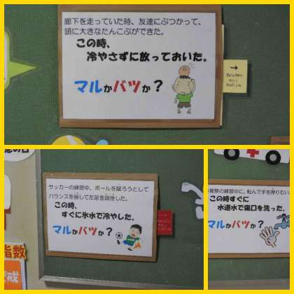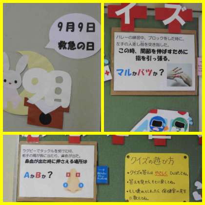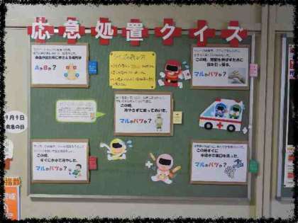 今日から9月になり、保健室前の掲示板もリニューアルしています。 今月は応急処置についての豆知識です。